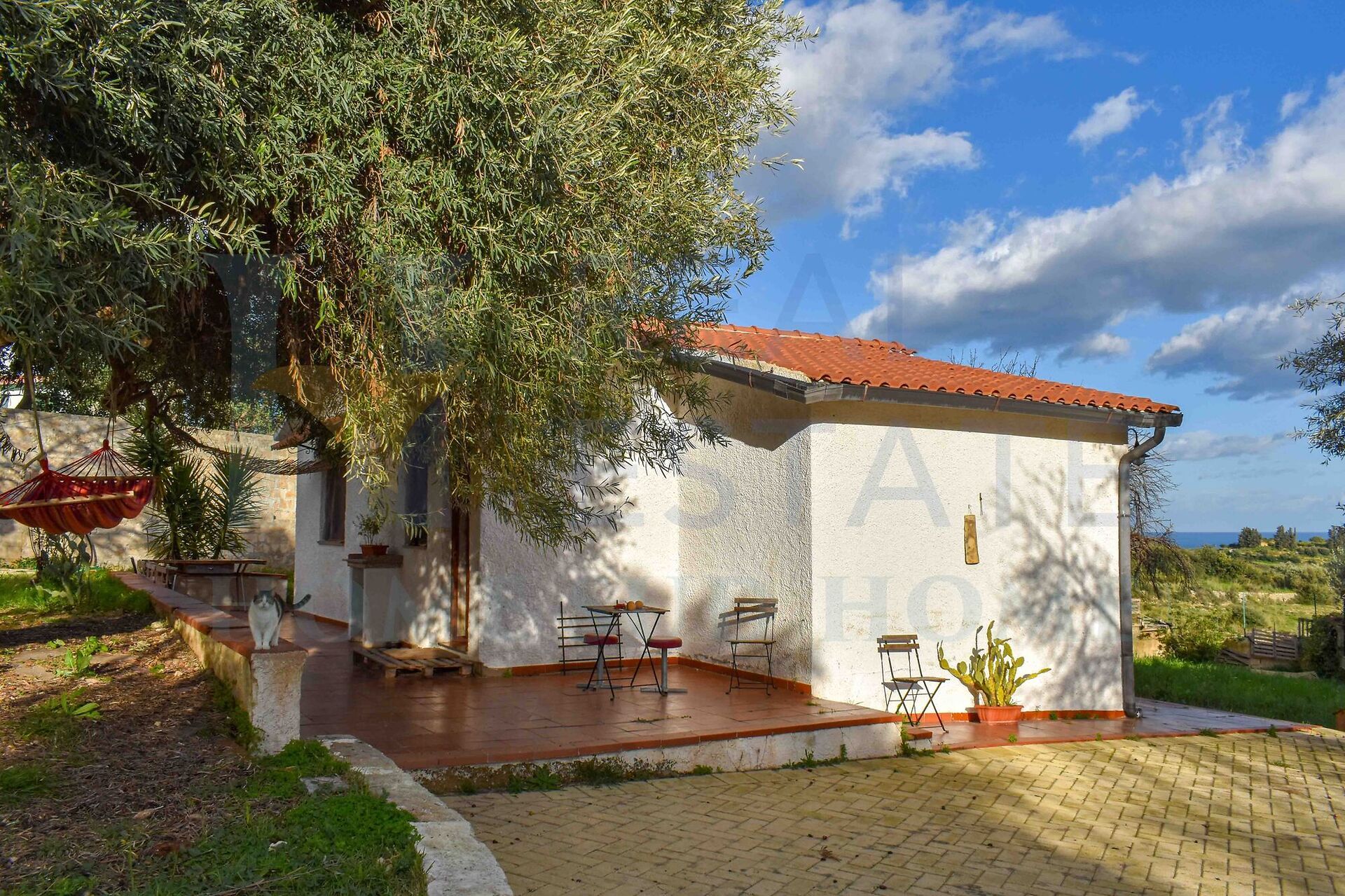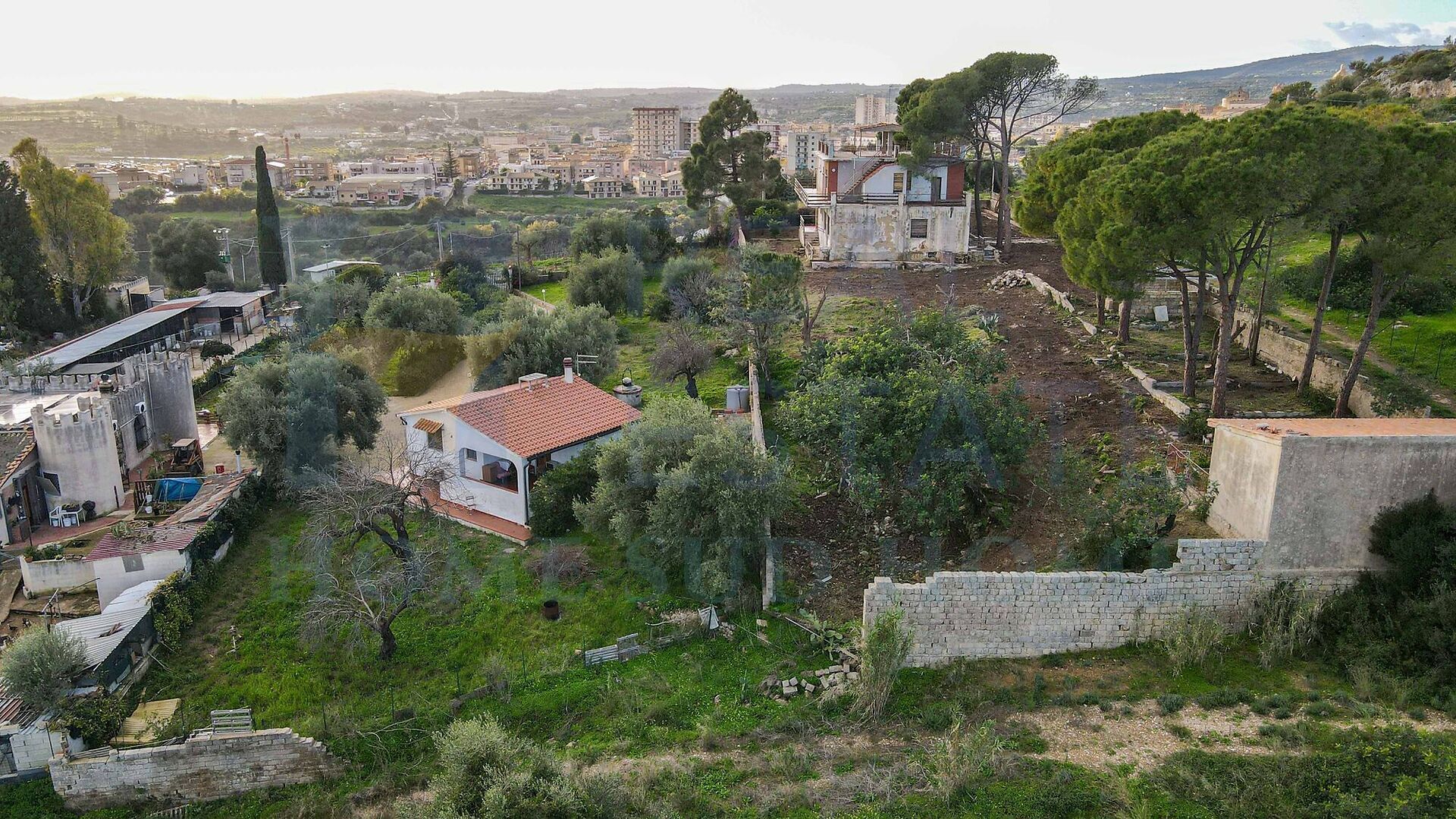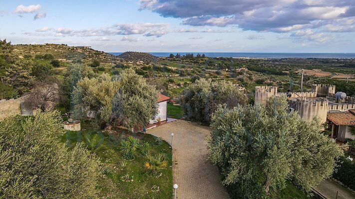 Il villino è circondato da un terreno di circa 1.800 mq, arricchito da ulivi e piante ornamentali tipiche siciliane, che conferiscono alla proprietà un’atmosfera autentica e mediterranea. Il terreno garantisce privacy e spazio sufficiente per creare aree relax, giardini o piccoli angoli verdi, valorizzando ulteriormente la vista aperta sulle campagne circostanti e sul mare.