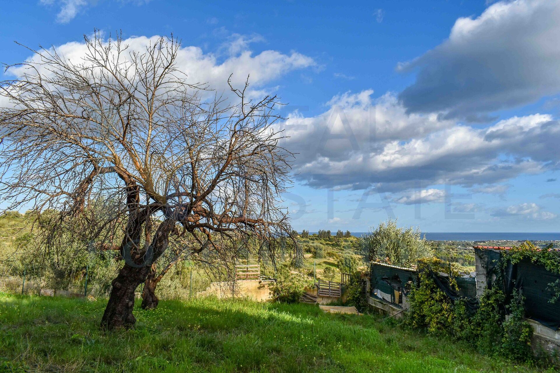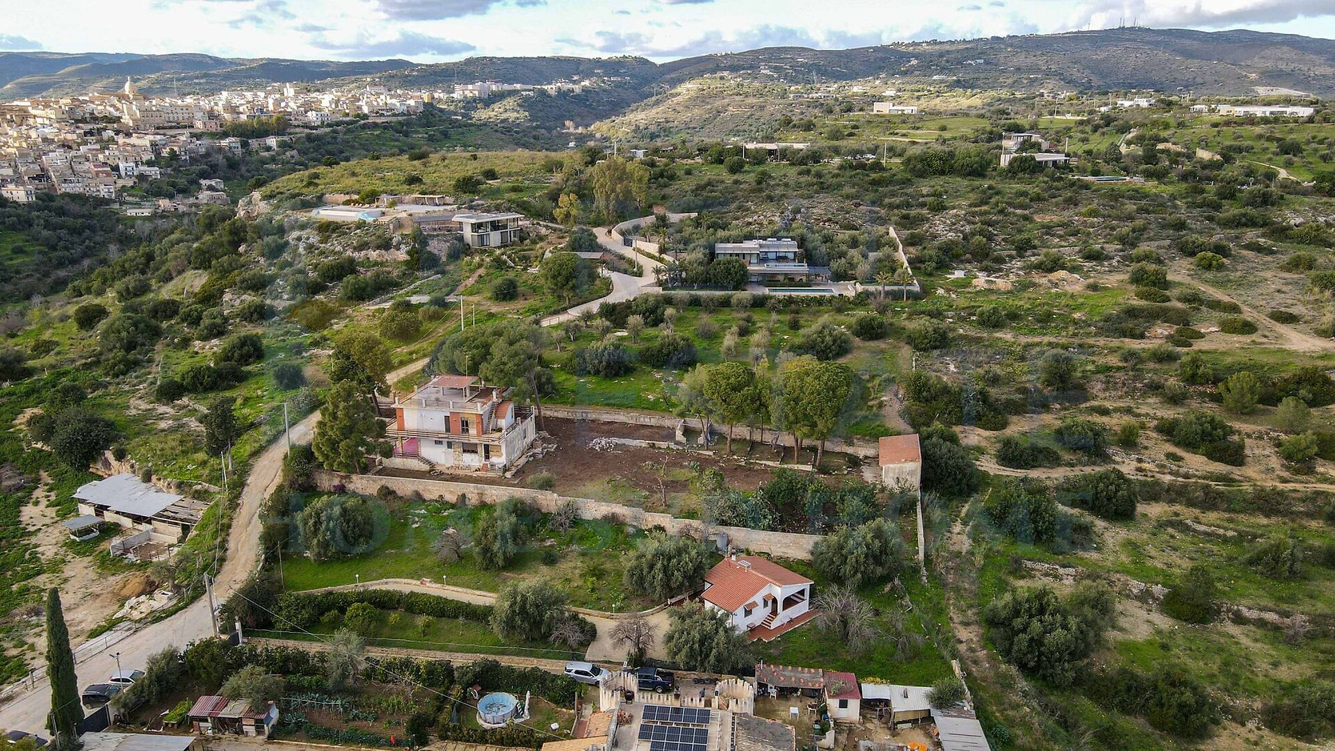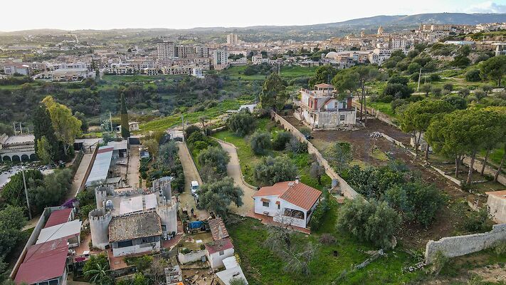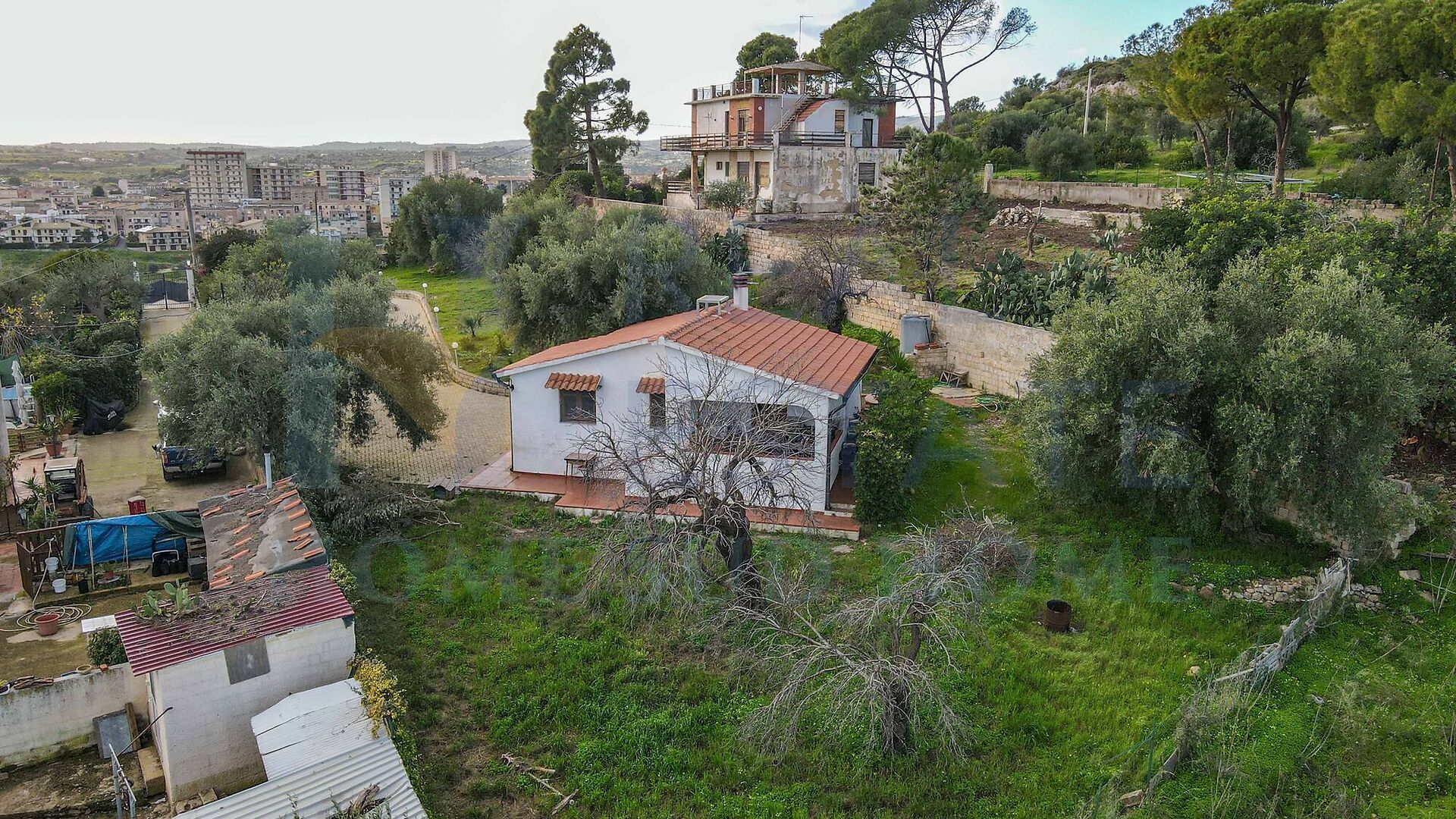 Il villino è circondato da un terreno di circa 1.800 mq, arricchito da ulivi e piante ornamentali tipiche siciliane, che conferiscono alla proprietà un’atmosfera autentica e mediterranea. Il terreno garantisce privacy e spazio sufficiente per creare aree relax, giardini o piccoli angoli verdi, valorizzando ulteriormente la vista aperta sulle campagne circostanti e sul mare.